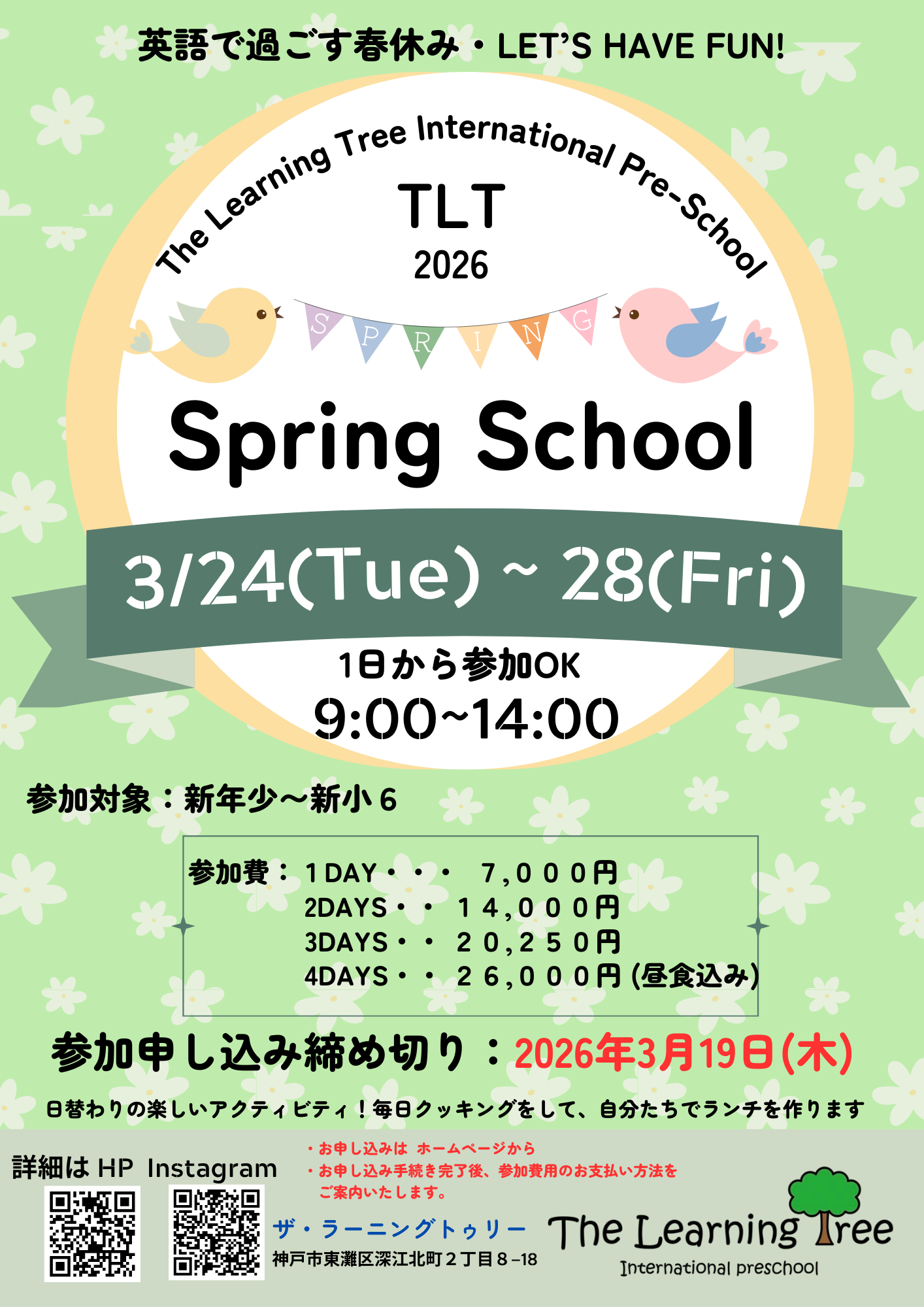 2026年2月21日 Spring School 2026 !! 今年もSpring School を行います☺️ 毎日自分たちでクッキング🍳レシピを考えたりみんなでショッピングに行ったり、生活の中での英語をたくさん使う週になります⭐️ 1日からでも参加可能です。 英語に興味がある方、大募集です!! ※参加対象:新年少〜新小6 ホームページよりお問い合わせください☺️ Filed Trip 2025TOPへ戻る 前へ戻る お知らせ一覧へ